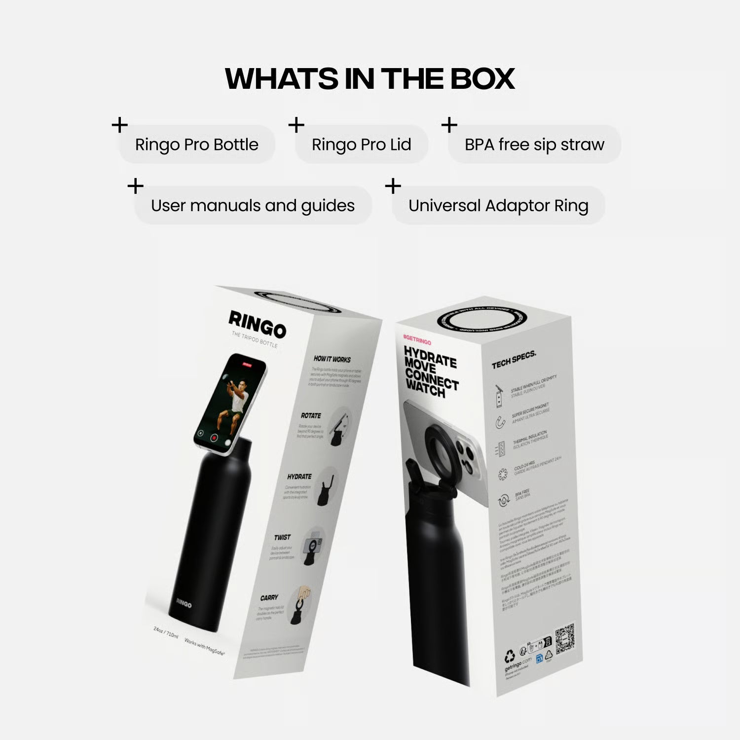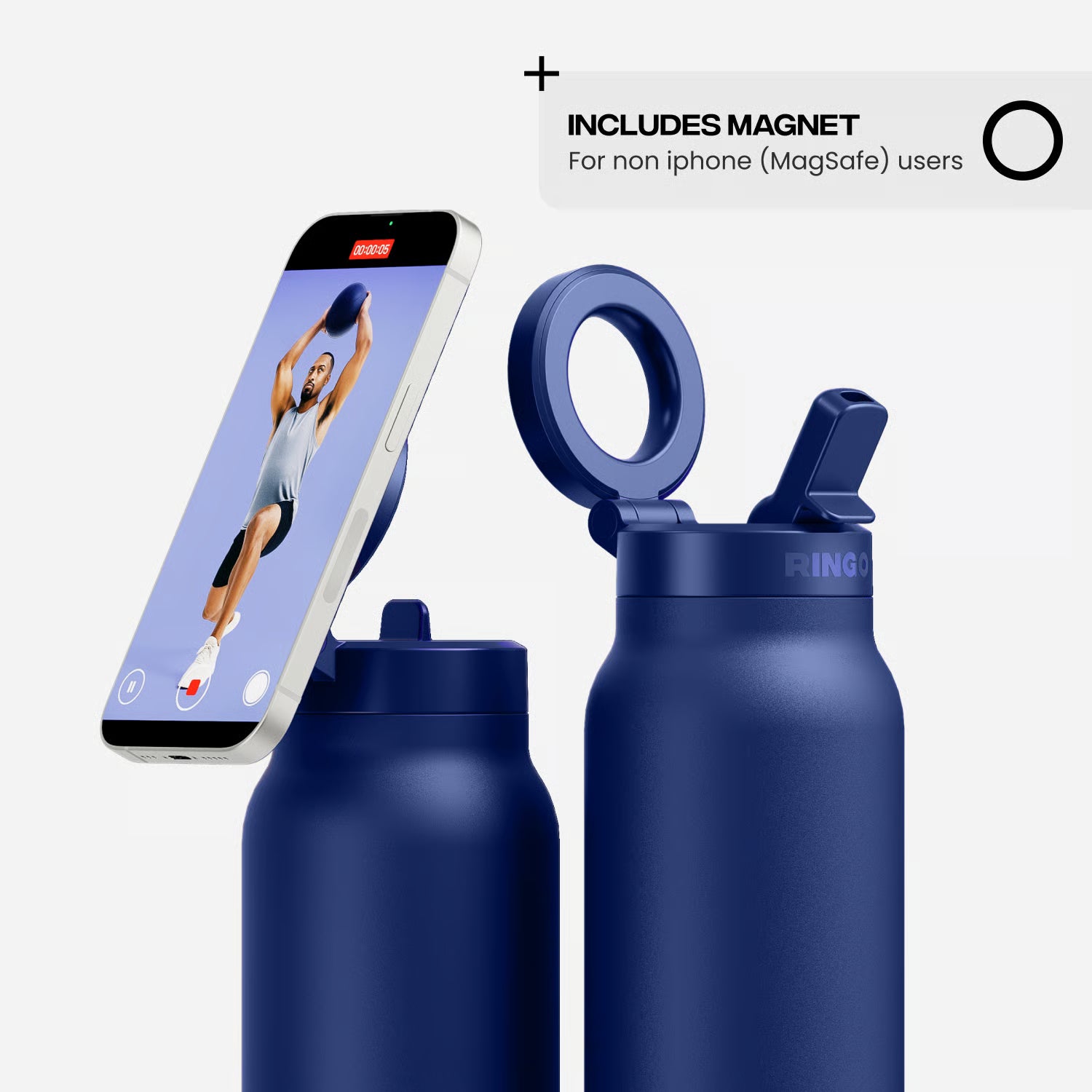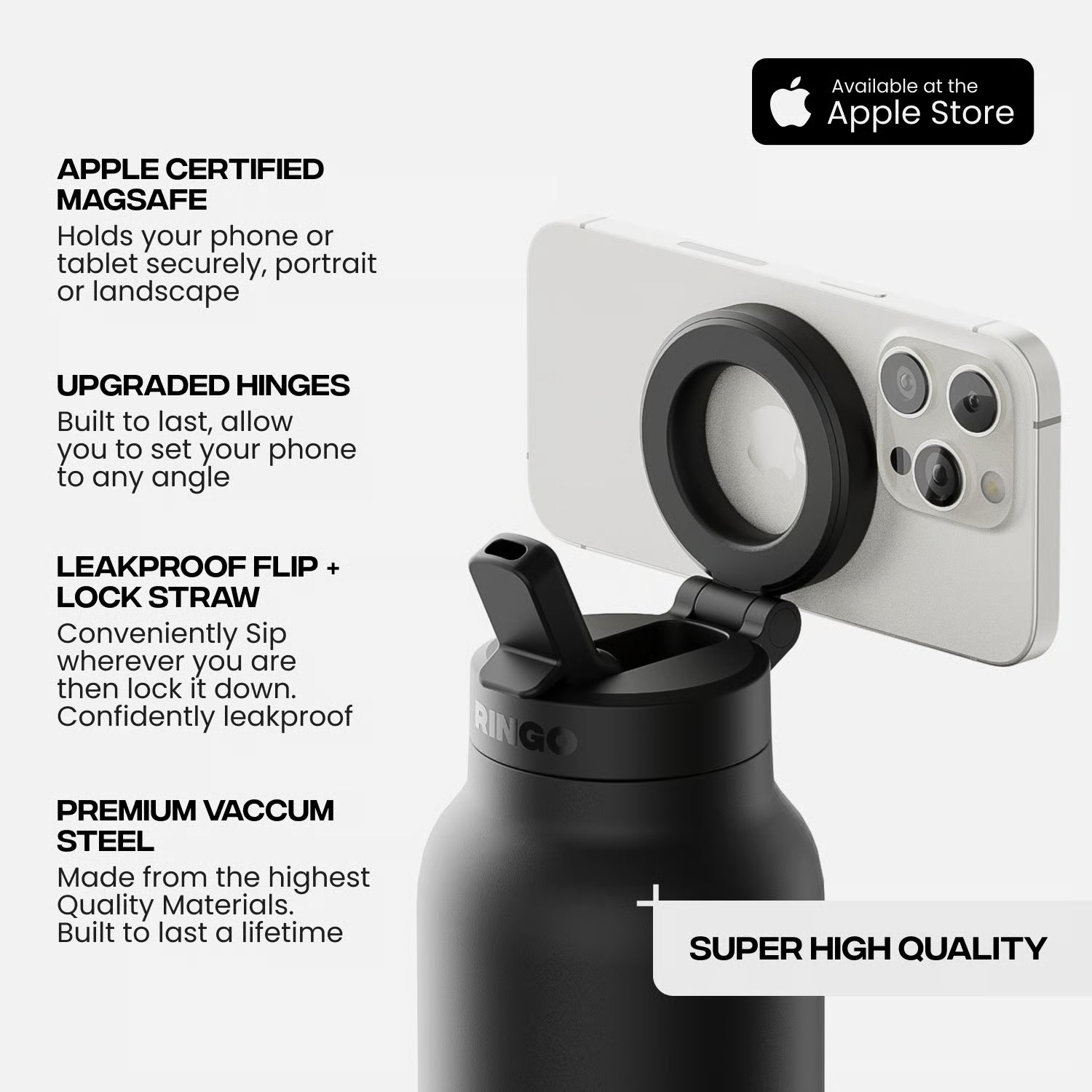 Ringo PRO isn’t just a water bottle—it’s a game-changer. With a built-in MagSafe-compatible mount, it securely holds your phone at the perfect angle for workouts, video calls, or content creation. No more awkward balancing acts—just seamless convenience.